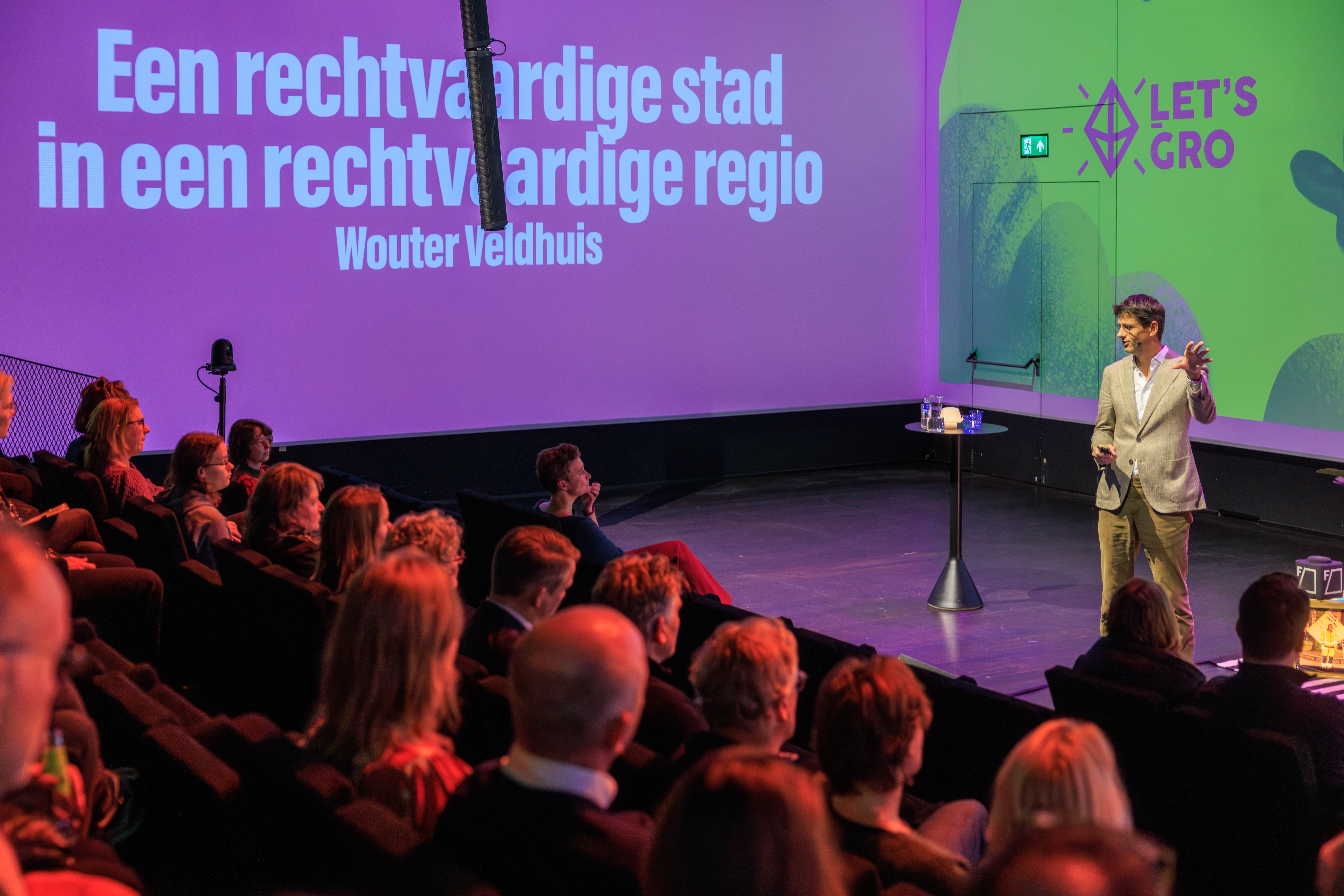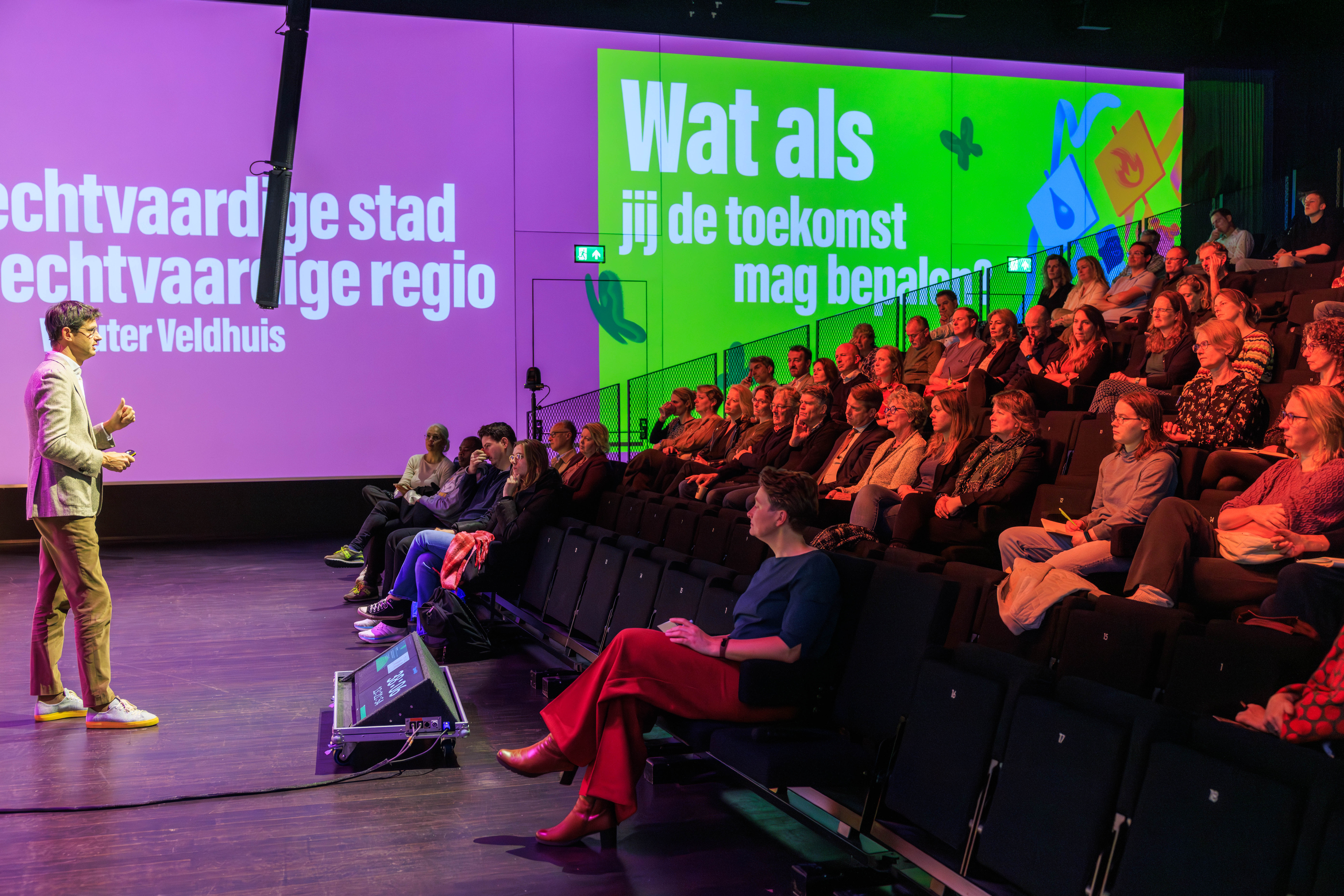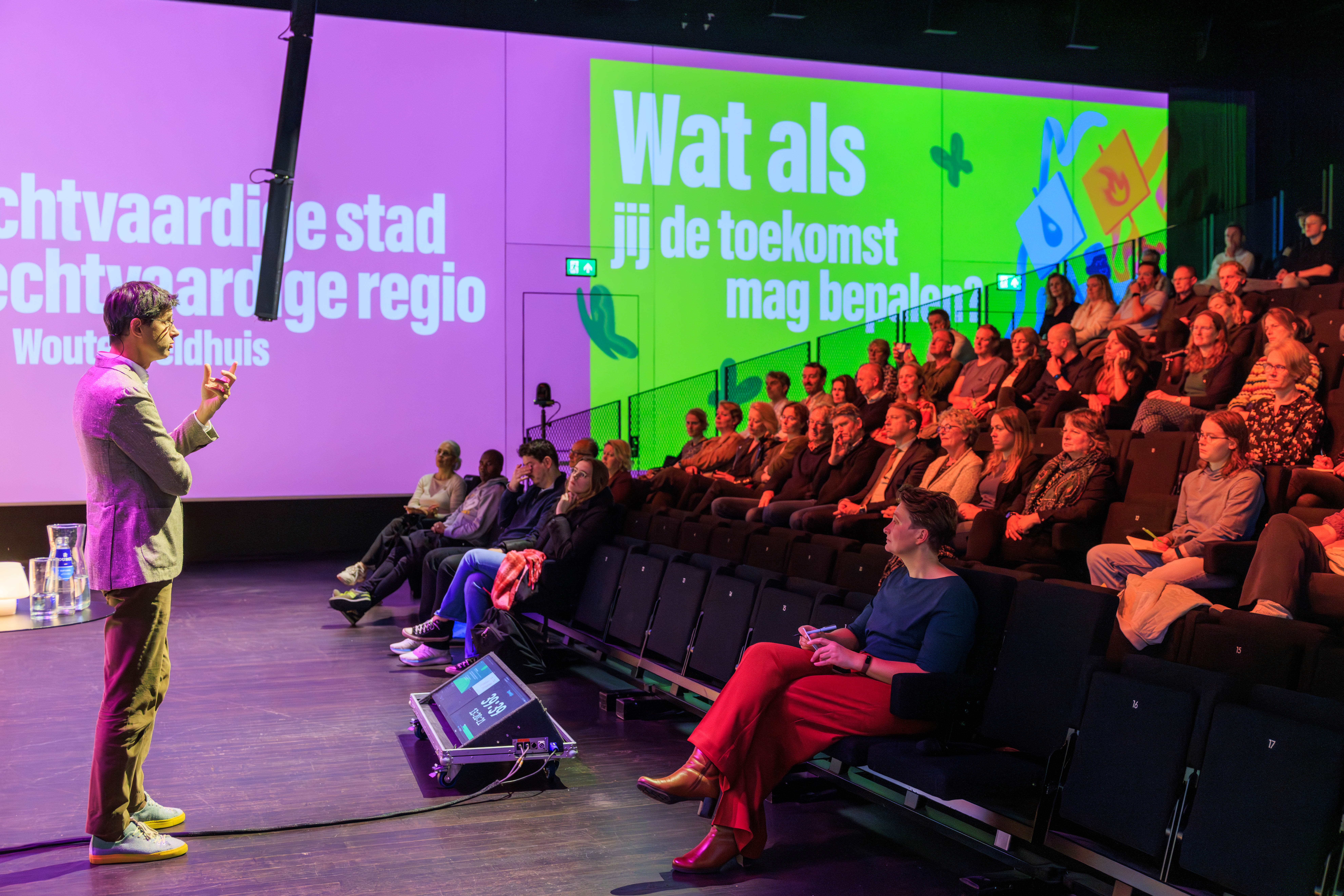 Voormalig Rijksadviseur voor de Fysieke Leefomgeving Wouter Veldhuis (MUST stedebouw) nam de aanwezigen mee in zijn visie op rechtvaardige ruimtelijke ontwikkeling. Volgens hem zijn er twee schaalniveaus die ertoe doen: de buurt (de woonomgeving van mensen) én de regio (de leefomgeving van mensen). Het zijn de plekken waar mensen elkaar ontmoeten, en waar samenwerking tussen bewoners, overheid en markt vorm krijgt.